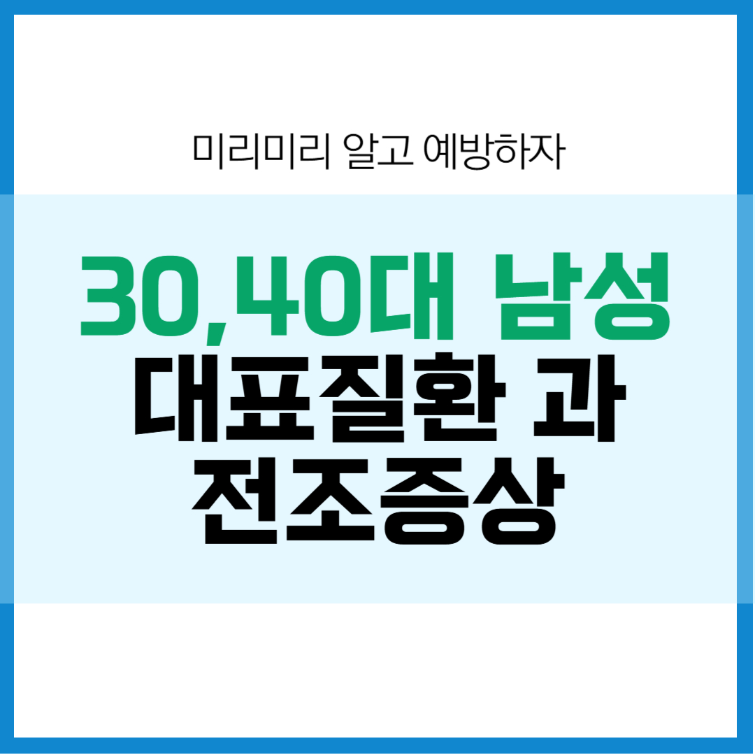 오늘은 30대,40대 남성들이 흔히 걸리는 대표 질병에 대해 알아볼건대요. 남성에게도 30,40대는 인생의중요한 전환점이자 건강 관리의 필요성이 더욱 절실하게 느껴지는 시기입니다. 이 시기에 접어든 남성들은 직장 생활의 스트레스, 불규칙한 식습관, 운동 부족 등 다양한 요인으로 인해 건강에 적신호가 켜질 수 있습니다. 하지만 많은 이들이 바쁜 일상 속에서 이러한 경고 신호를 간과하곤 합니다. 오늘은 30,40대 남성들이 흔히 걸리는 대표 질병과 그에 따른 전조증상에 대해 소개해보려고 합니다.
