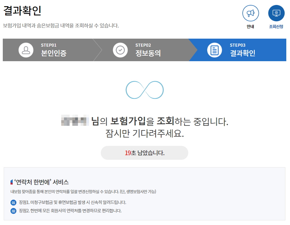 ▼ ③인증이 다 끝났다면 '내보험찾아줌' 프로그램이 내 보험가입 여부를 조회하는 시간을 갖습니다.