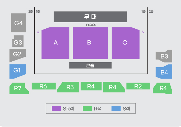 - 일부 좌석은 무대 연출 및 아티스트의 위치에 따라 안전펜스 및 콘솔, 출입문 위치, 무대구조물, 장치, 카메라 등으로 인해 시야가 방해될 수 있습니다. 이로 인한 티켓 취소, 교환, 환불은 불가합니다.