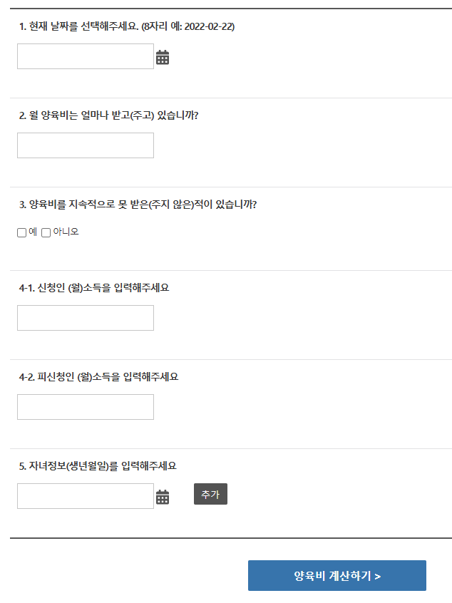 '양육비이행관리원' 사이트에 들어가시면 신청자가 양육비 이행확보 지원 대상자에 적합한지 또 얼마의 양육비를 받을 수 있는지 양육비 계산기가 있으니 들어가셔서확인해 보는 것도 좋을 것 같습니다.