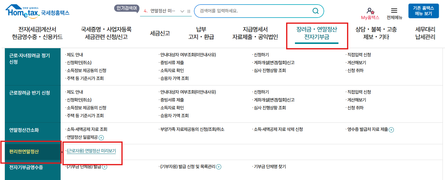 - 연말정산 미리보기 접속: 홈택스 접속 →메뉴 장려금,연말정산,전자기부금 →편리한 연말정산 →(근로자용)연말정산 미리보기 선택